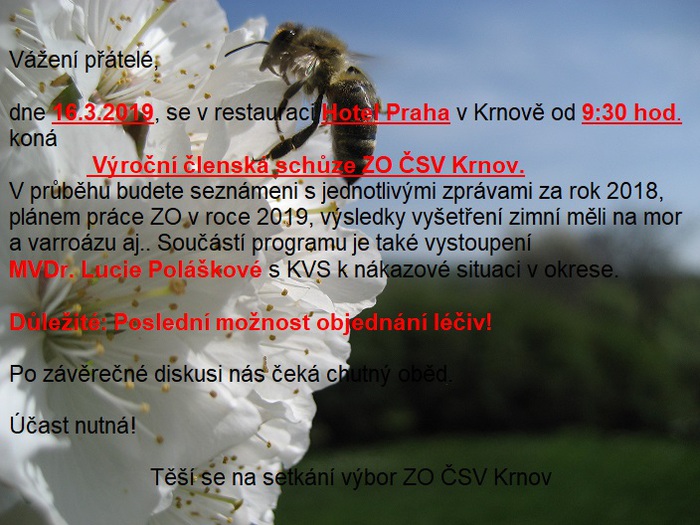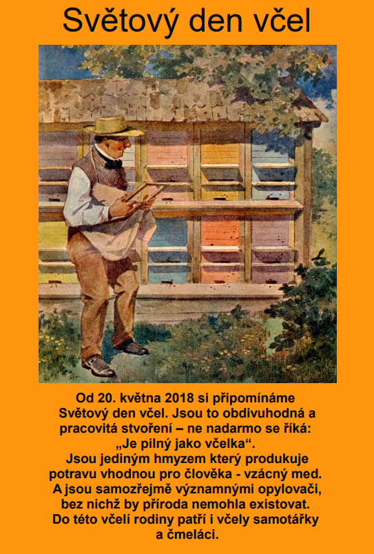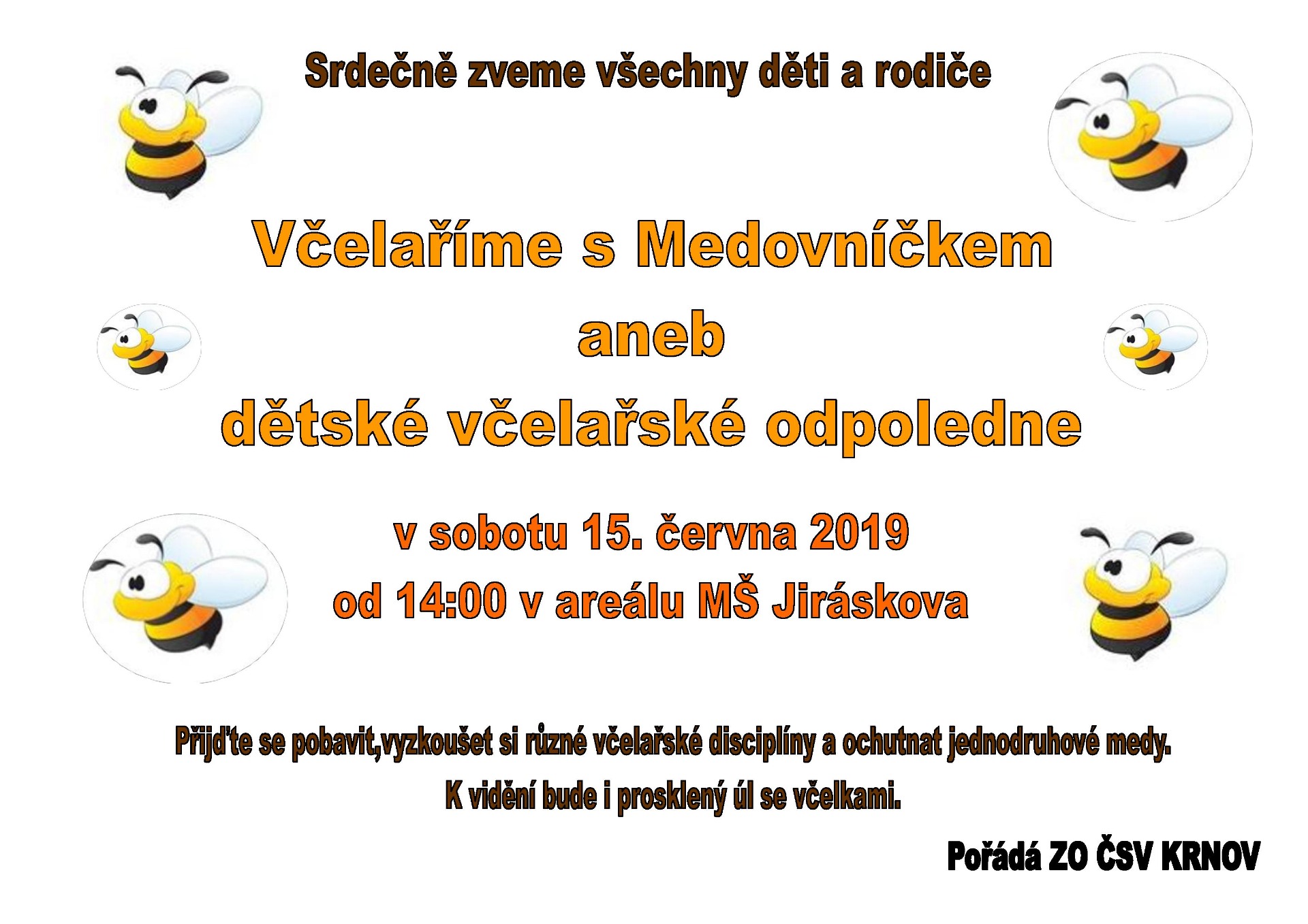 Naše včelařky a knihovnice z Městské knihovny Krnov - pobočka Jiráskova připravily dětem z MŠ Svatováclavská Krnov, Úvalno, Jirásková a žákům 3. A.. ZŠ Smetanův okruh besedu o životě včel, jejich užitku a hlavně zásadním významu pro náš život. Besedami provázely děti pilné včelky Naďa a Jana, které jim pověděly a poté názorně představily věci, které děti o včelkách zatím vůbec netušily. Při besedě bylo také k vidění oblečení správného včelaře, které se skládá z kombinézy, kukly, rukavic a včelařských pomůcek. Dále pak věci, které jsou potřebné při práci se včelami - např. rozpěrák, dýmák a mnoho dalšího. Co ovšem budilo největší zájem dětí byl prosklený včelí úl, v němž mohly děti vidět realný život ve úle.. Díky příznivému počasí mohly být využity také zahrada mateřských škol, kde byly pro děti připraveny venkovní aktivity. Vyzkoušely si, jak včeličky sbírají nektar z kytiček, jak se lítá z květu na květ, skládaly si puzzle se včelkami a samozřejmě nesměly chybět ani knihy o včelách, které si děti se zájmem prohlížely a moc se jim líbily. Včelí setkání bylo ukončeno ochutnávkou medu a předáním malých dárků dětem.